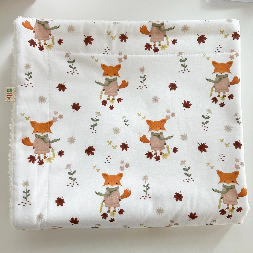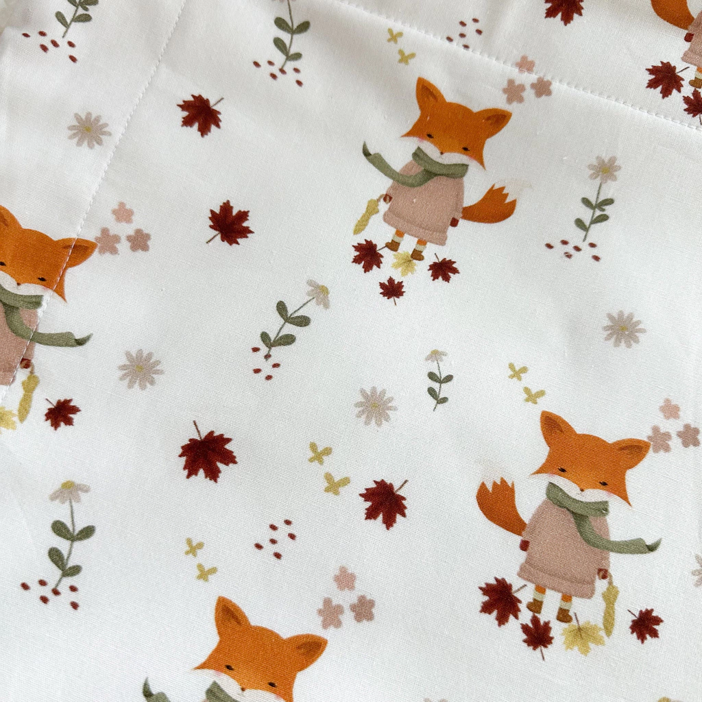 Estampa: branca com estampas de raposinha e folhinhas do outono, 100% algodão